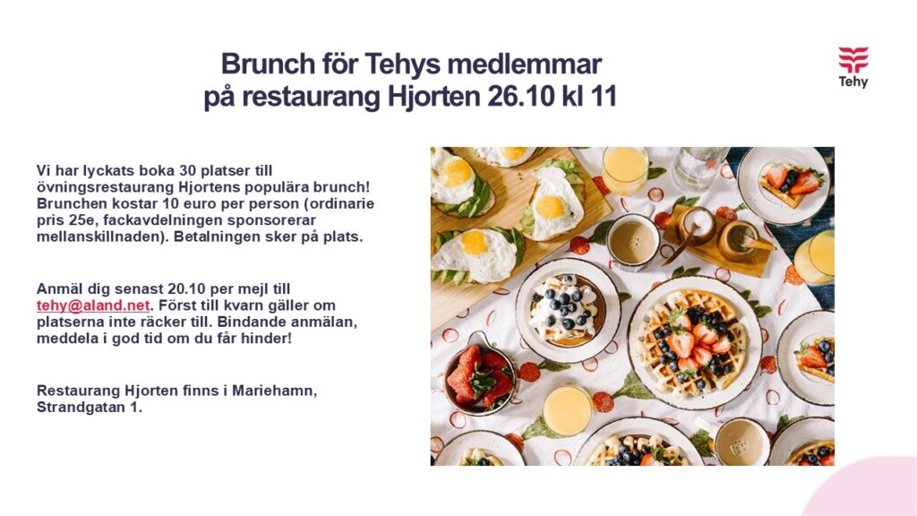 Kontoret i Mariehamn är bemannad igen den 1 september. I icke-brådskande ärenden kan du mejla tehy@aland.net så återkommer jag när jag är åter på jobb. Fackavdelningens styrelse har möte nästa gång den 11 september. Initiativ som ska behandlas av styrelsen ska skickas till tehy@aland.net senast en vecka innan.