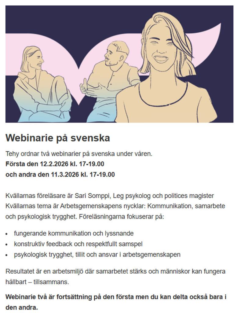 Mycket information finns också på webbplatserna tehy.fi och tehy.ax och om det finns behov av att sköta ärenden kan du alltid logga in i e-tjänsten på rikets Tehys webbplats. E-tjänsten fungerar dygnet runt under alla årstider. Meddelanden från Tehys e-tjänst gås igenom varje vardag.